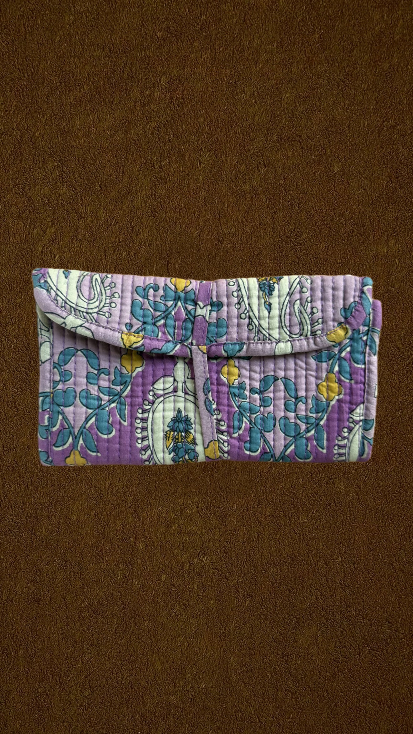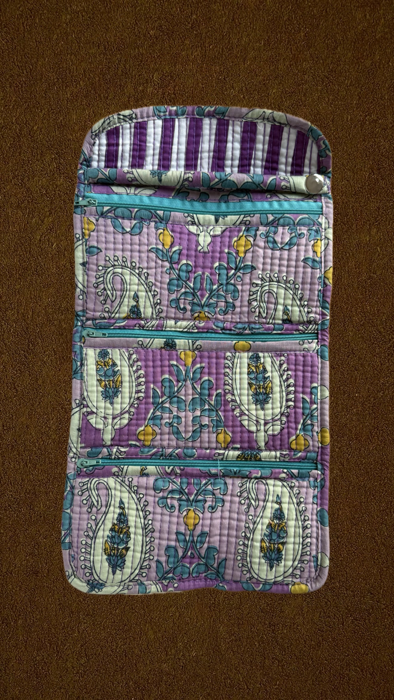 Organizador de viaje artesanal en tela block print con delicados motivos florales en tonos malva y verde. Tres compartimentos interiores con cierre enrollable. Elegancia y funcionalidad en cada detalle.