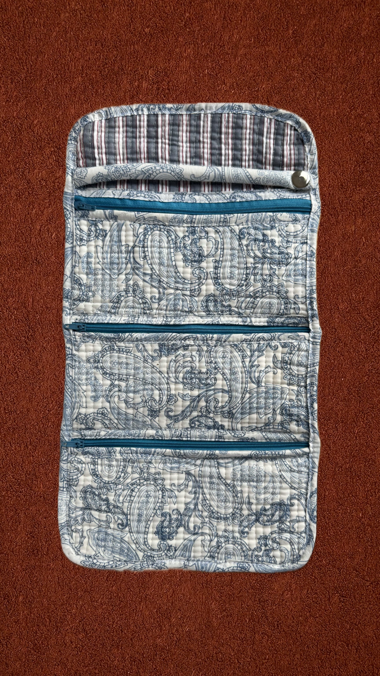 Organizador de viaje artesanal en tela block print con motivos paisley en tonos azul y gris. Tres compartimentos interiores con cierre enrollable. Sofisticación para tus viajes.