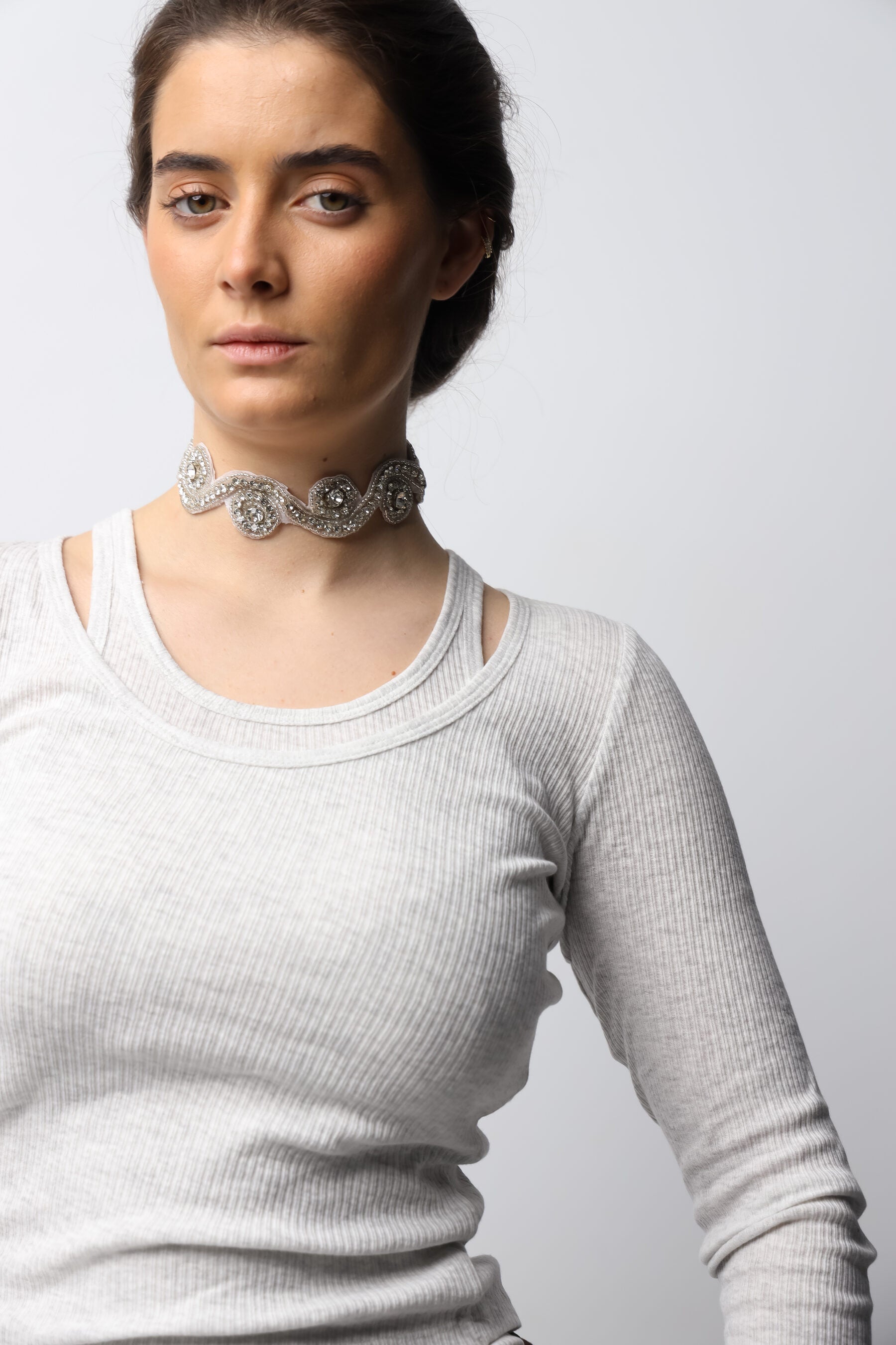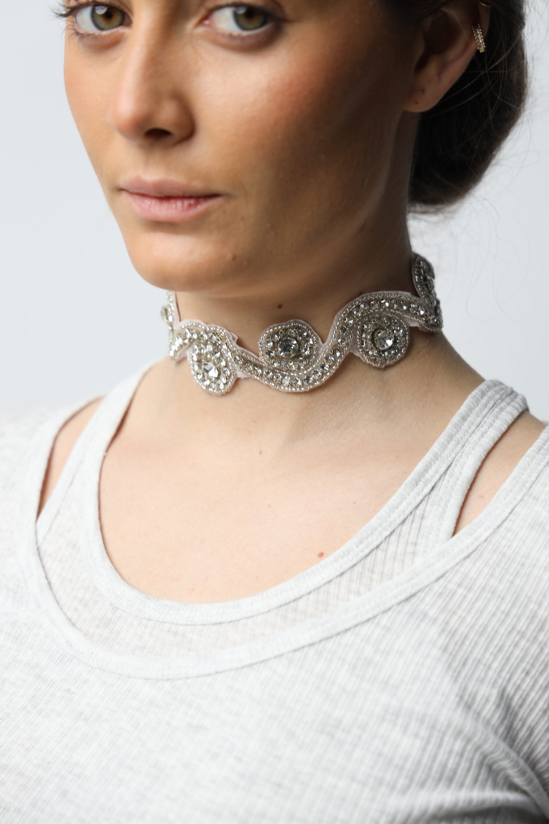 Choker con circonitas engarzadas en acabado plata. Brillo intenso. Cierre trasero ajustable.