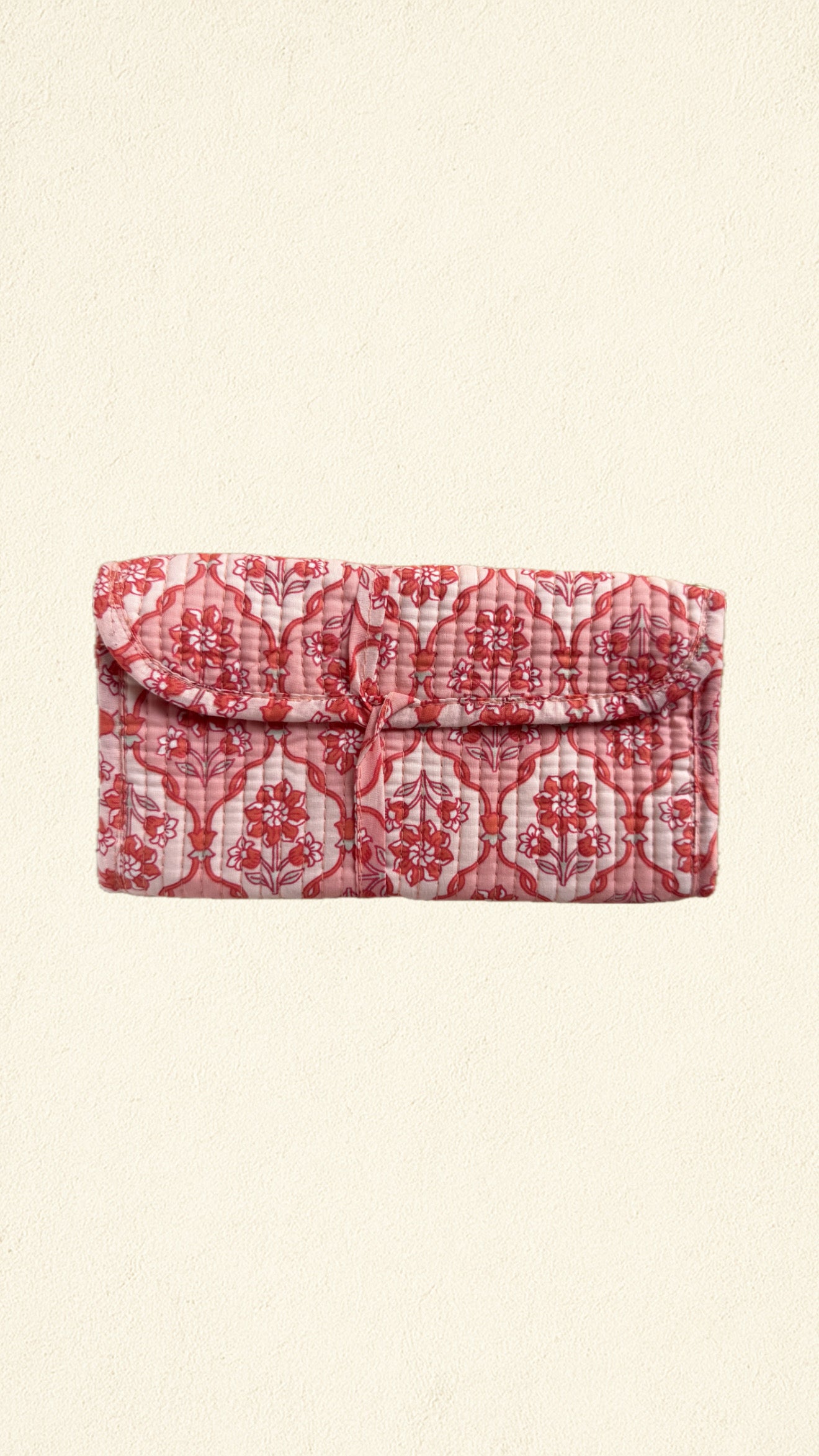 Organizador de viaje artesanal confeccionado en tela block print con motivos paisley en tonos terracota. Tres compartimentos interiores con cierre enrollable. La pieza perfecta para viajeras con estilo.