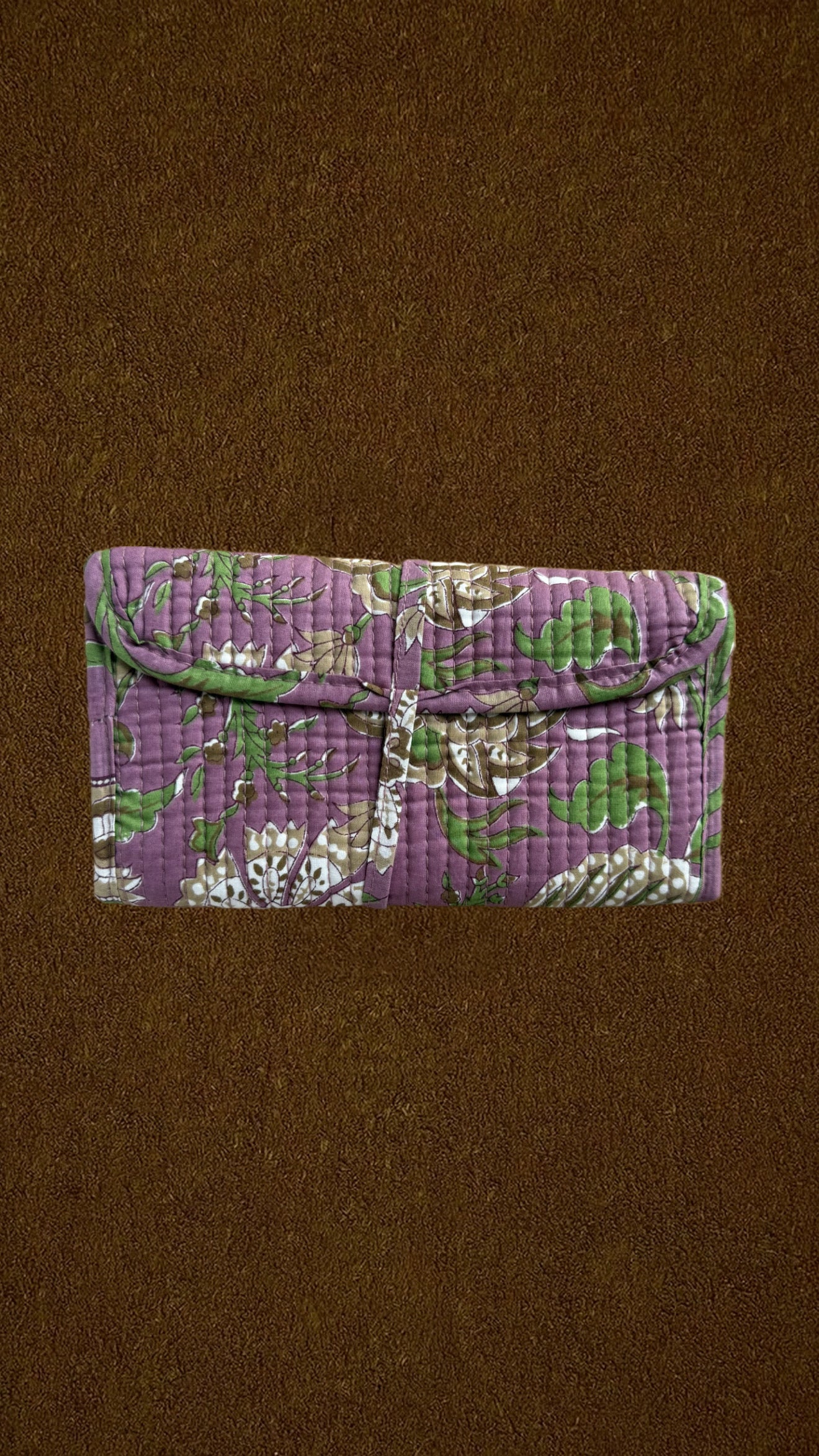 Organizador de viaje artesanal en tela block print con estampado geométrico en tonos rosa y verde. Tres compartimentos interiores con cierre enrollable. Un diseño único que combina tradición y modernidad.