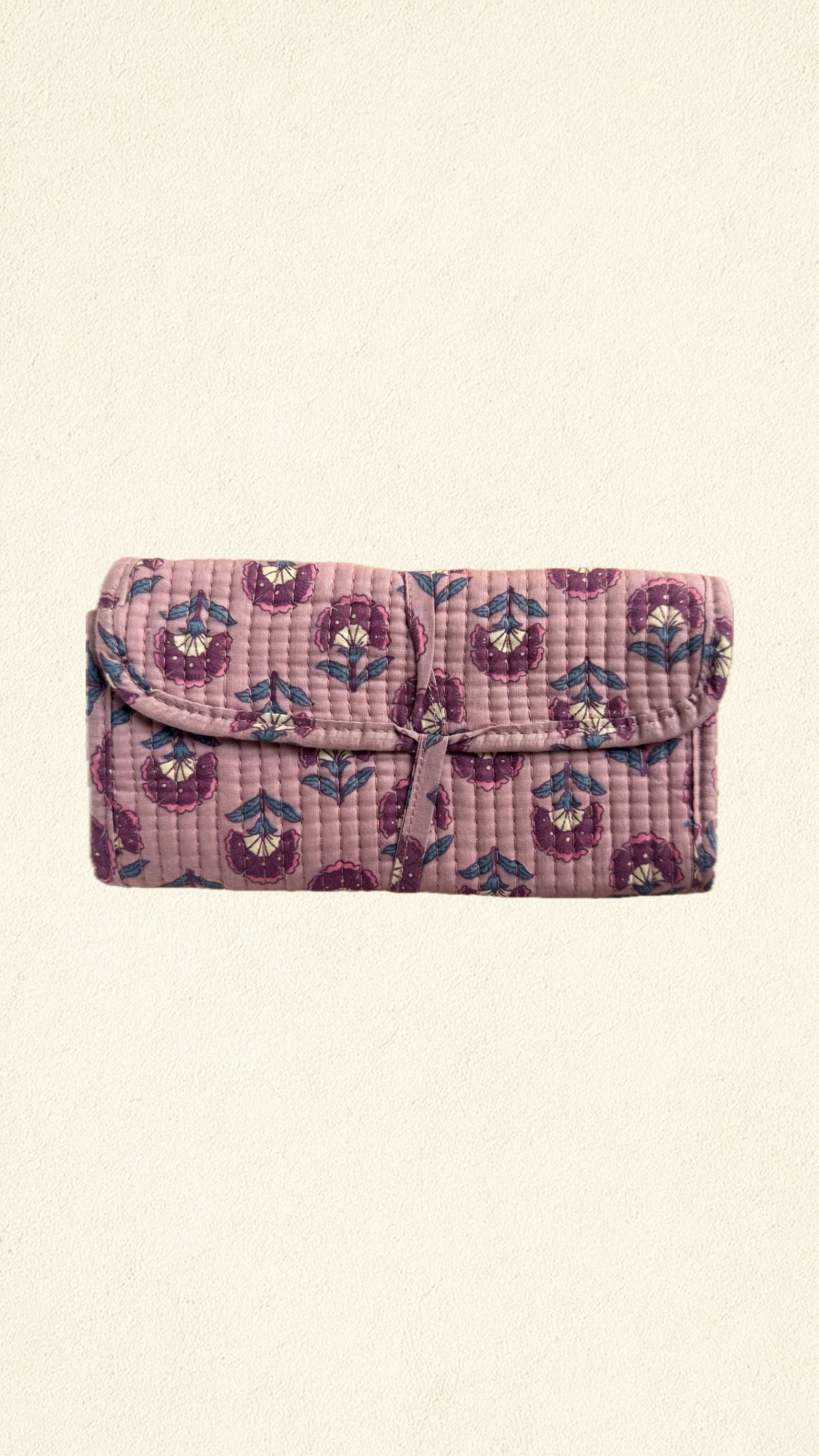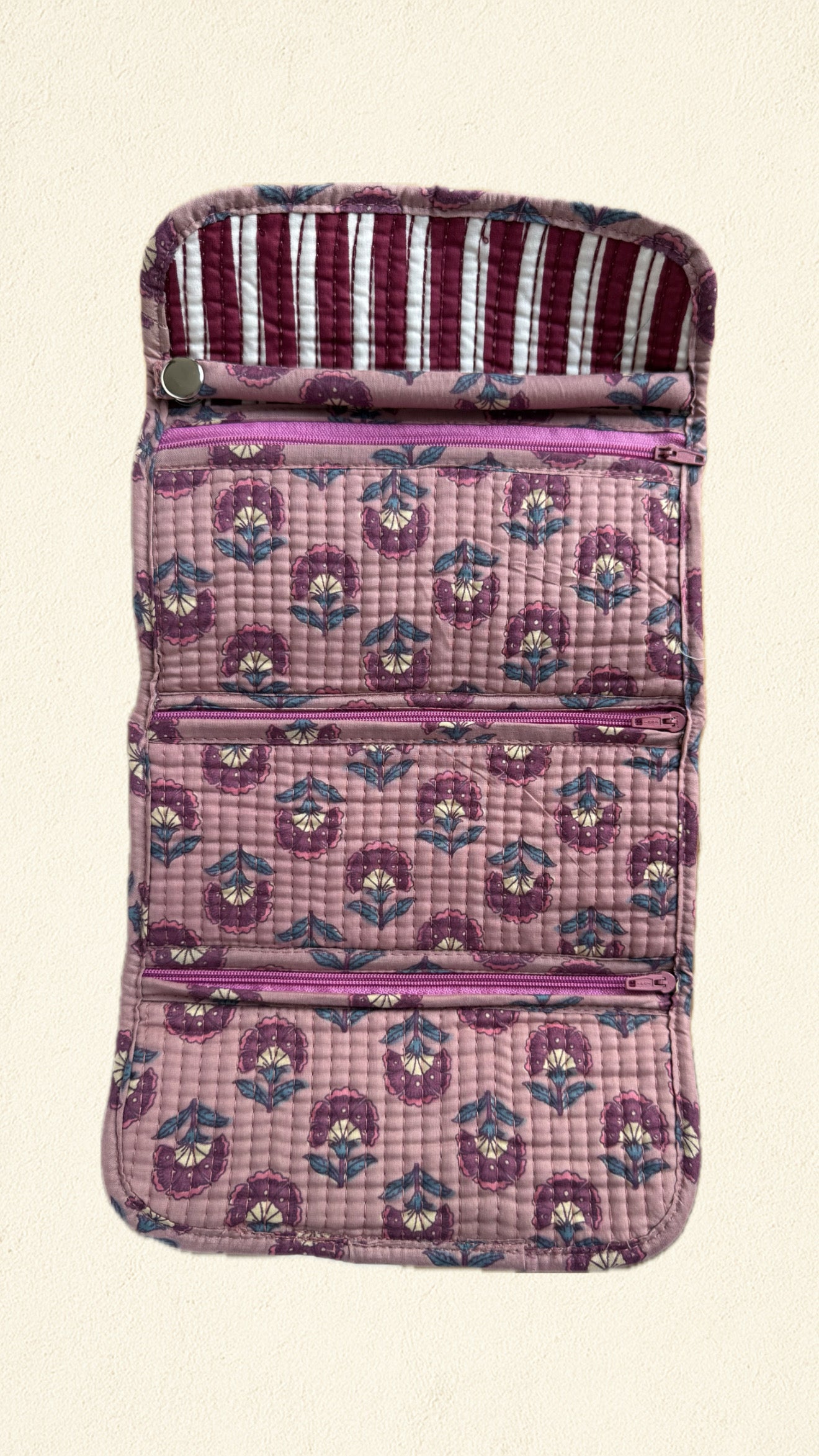 Organizador de viaje artesanal en tela block print con delicadas flores en tonos rosa sobre fondo rayado. Tres compartimentos interiores con cierre enrollable. Romanticismo y funcionalidad.