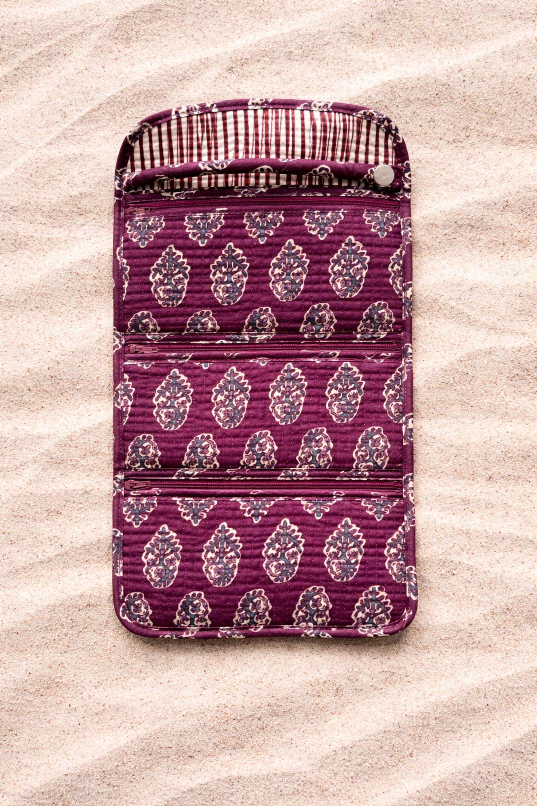 Joyero de viaje plegable con estampado artesanal. Interior con compartimentos. Cierre con botón.